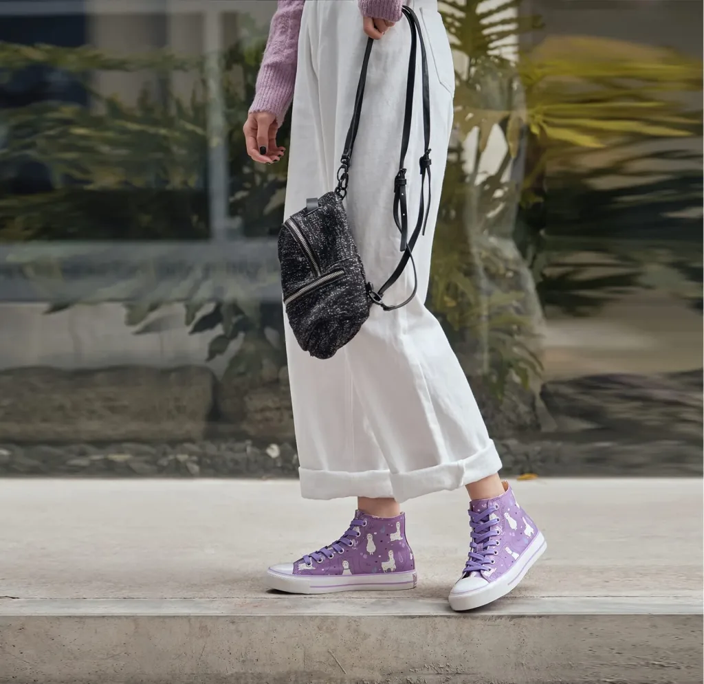 High-top patterned canvas shoes bring a casual lift to everyday wear. Pair them with cropped straight-leg jeans and a striped tee for a timeless street look. For a soft weekend vibe, wear them with a simple T-shirt dress and a light denim jacket. In cooler months, they work well with leggings, an oversized knit, and a scarf.