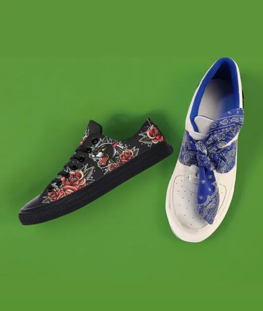 - Use patterned canvas shoes to add a point of interest to simple outfits.