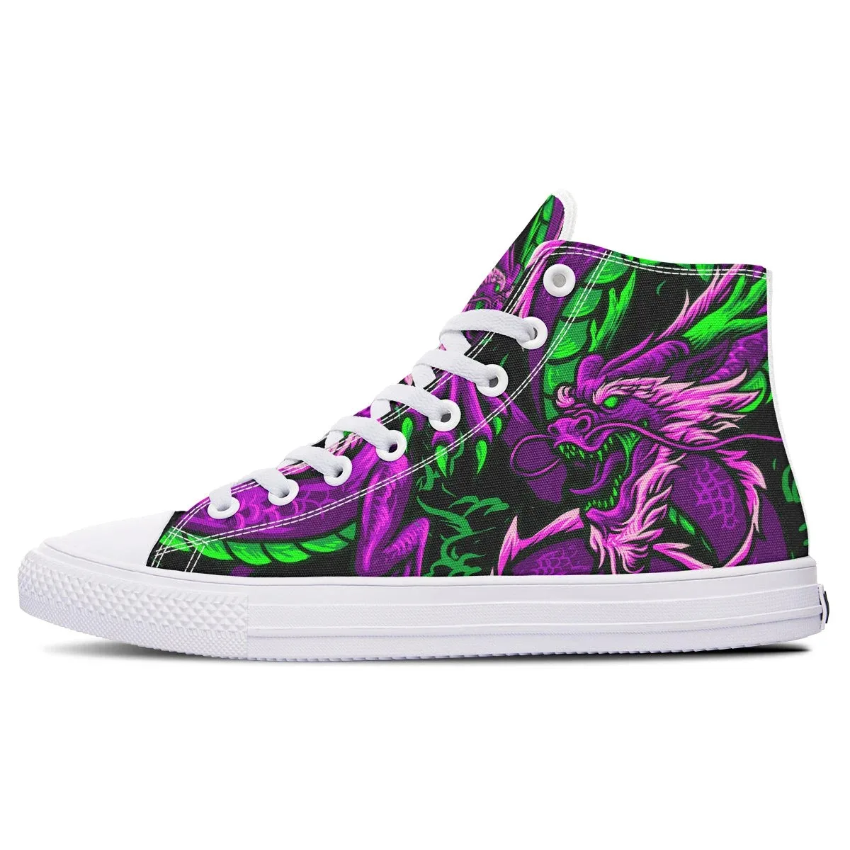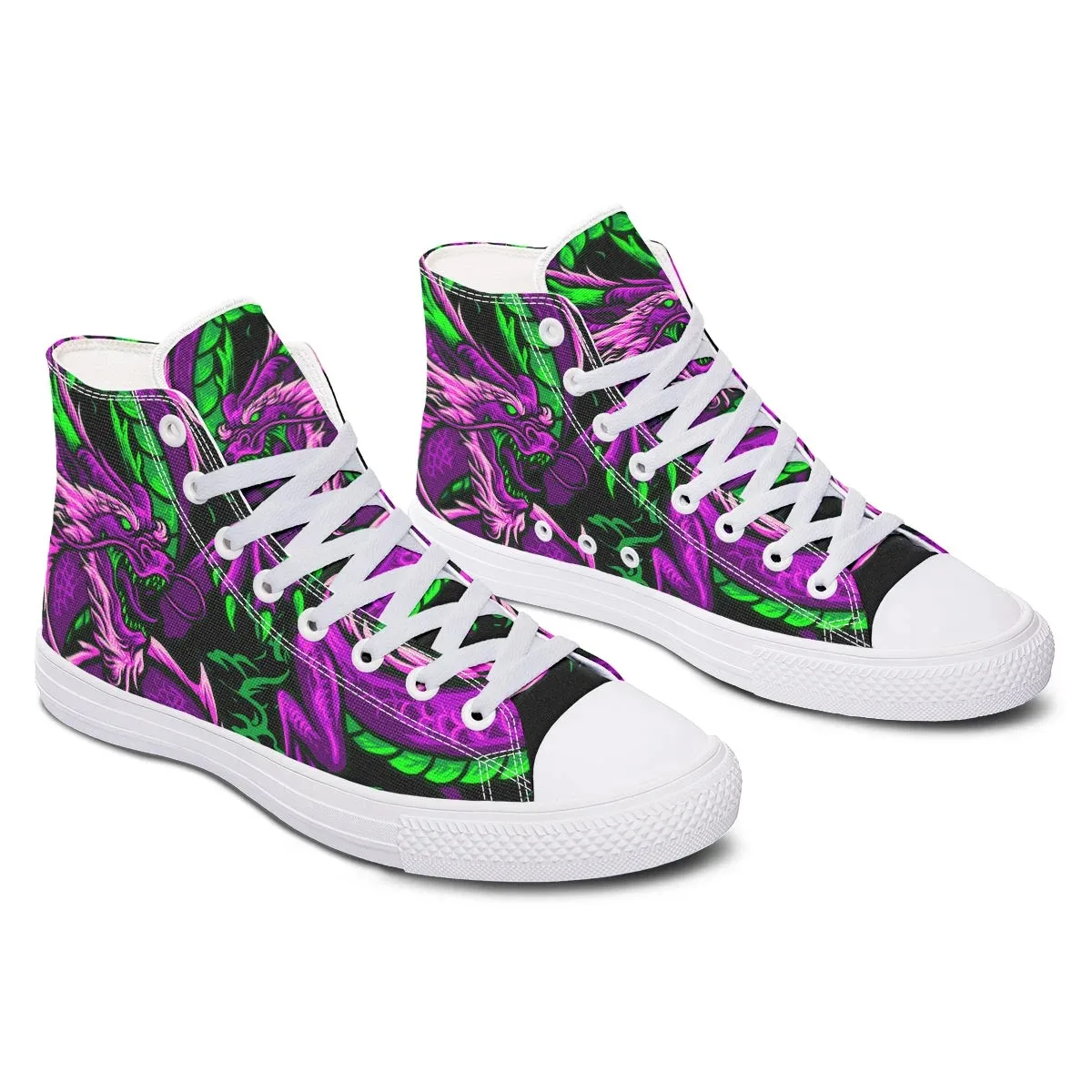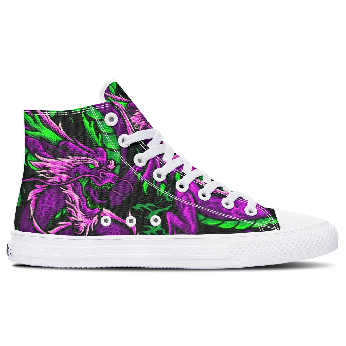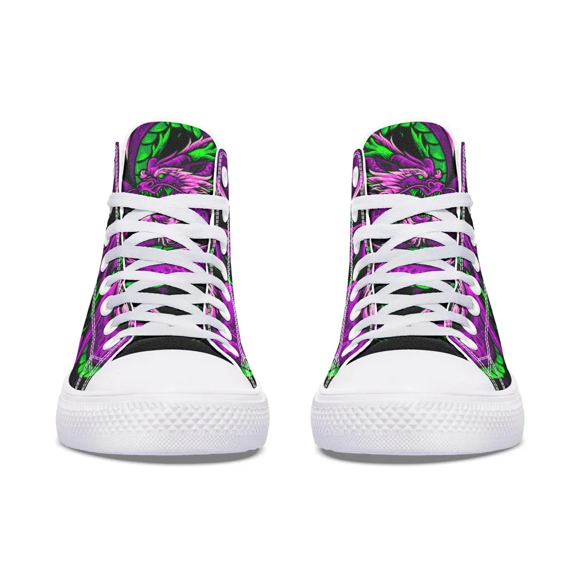 This shoe focuses on materials and design to bring the wearer comfortable, fashionable shoes. Purple Green Dragon High Canvas Shoes with sturdy, delicate seams, soft soles and linings, increasing comfort. The canvas material has elegant colors, is breathable and colorfast.