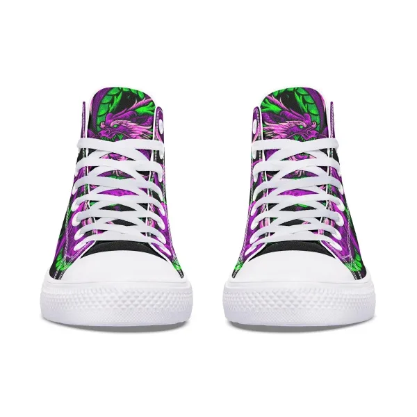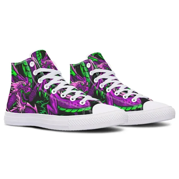 This shoe focuses on materials and design to bring the wearer comfortable, fashionable shoes. Purple Green Dragon High Canvas Shoes with sturdy, delicate seams, soft soles and linings, increasing comfort. The canvas material has elegant colors, is breathable and colorfast.